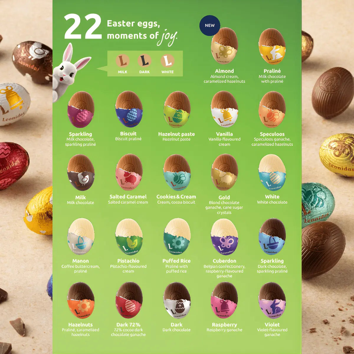 The accompanying mini eggs are selected from our 22-flavour Easter collection (assorted milk, white and dark varieties).