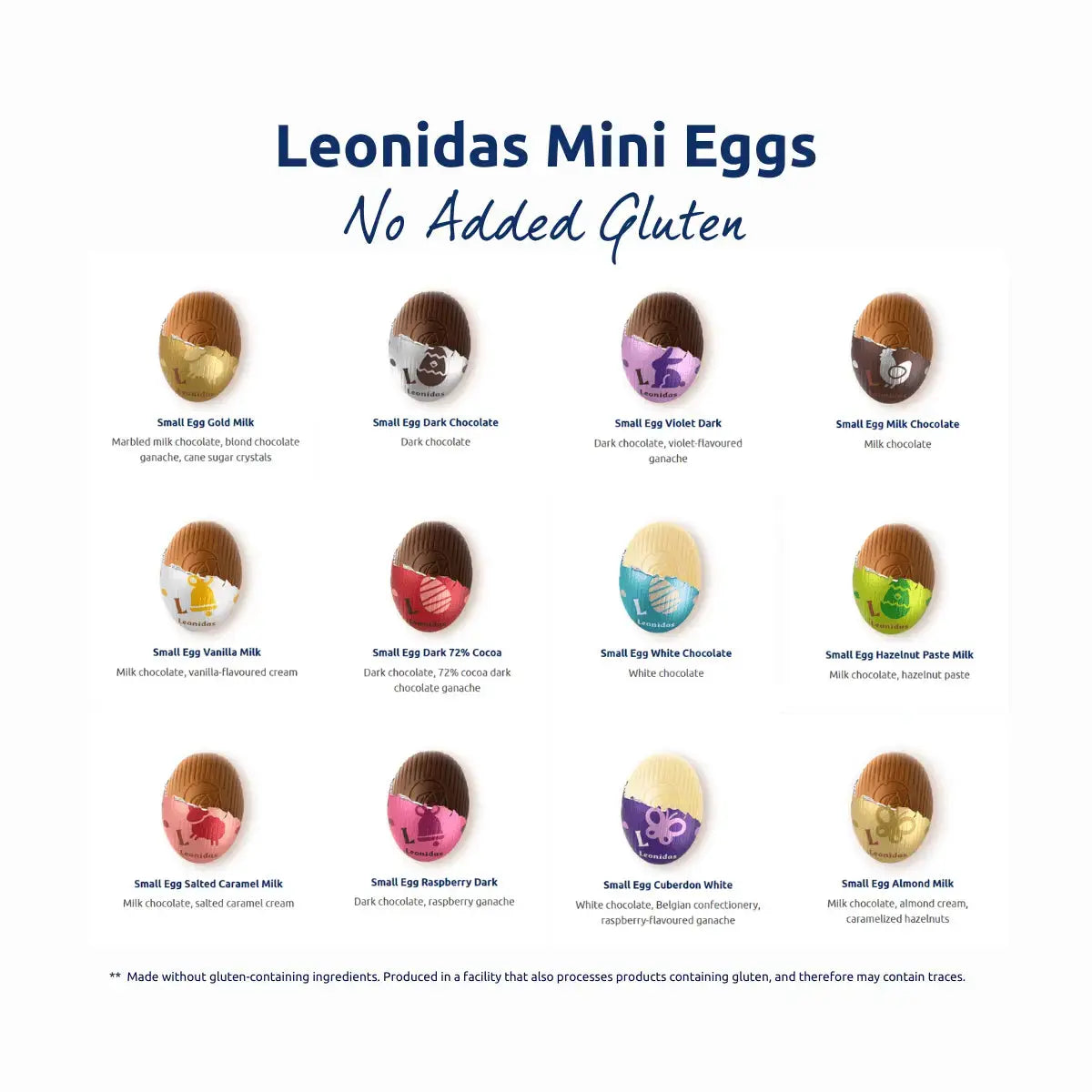 The assortment includes mini egg flavours from our Easter collection that do not contain gluten ingredients. Flavours may include: