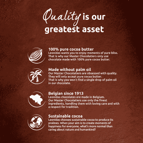 Leonidas Chocolates pride themselves on adhering to the traditional high quality flavors. Our chocolates are a uniquely fresh product. Our chocolates do not contain any vegetable fat, and we use only 100% cocoa butter. We use also fresh butter and cream in our butter creams in order to give them their unique flavor.