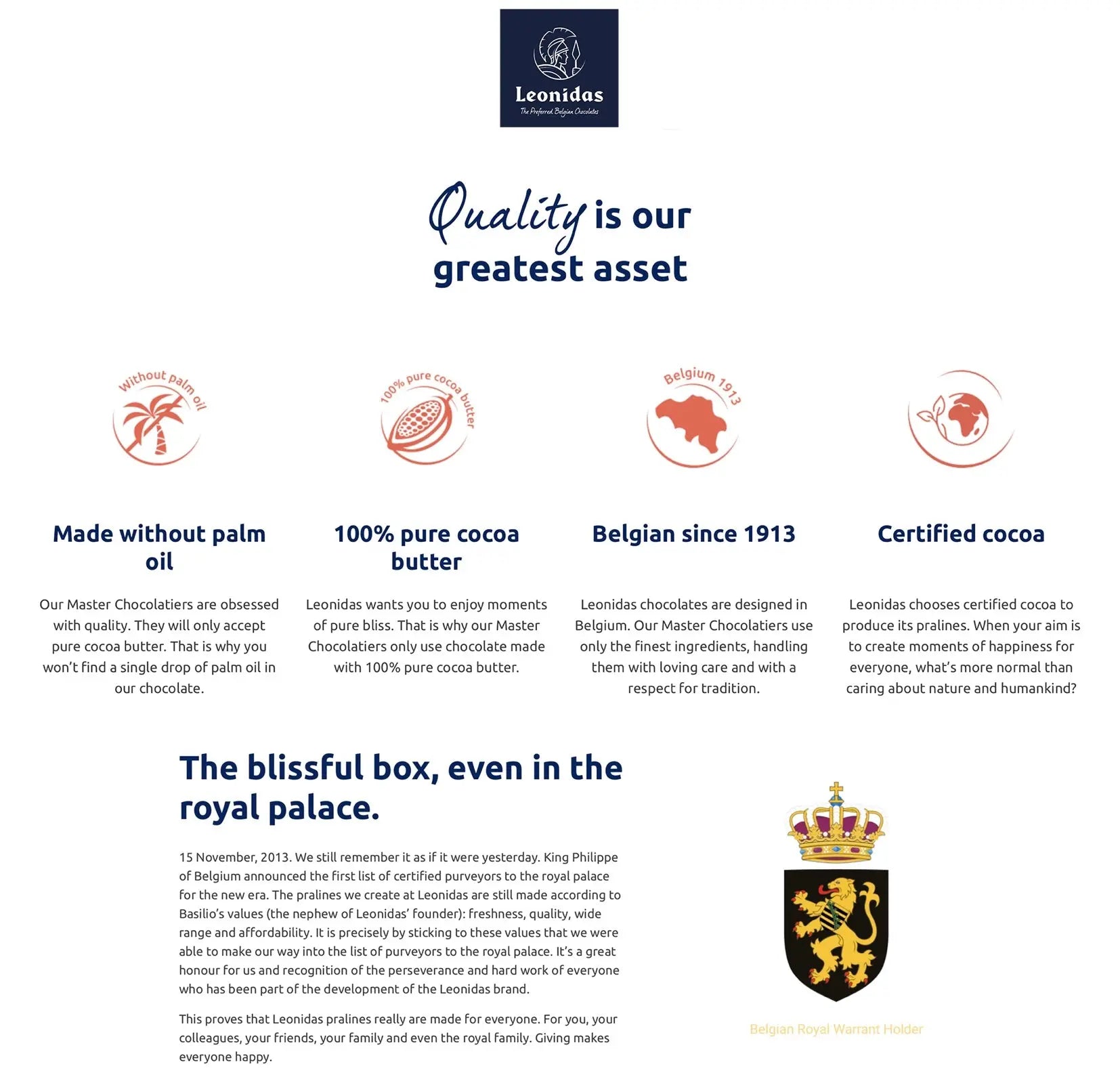 - Leonidas Chocolate is made with high quality cocoa beans, ground finely and only fresh and natural ingredients;